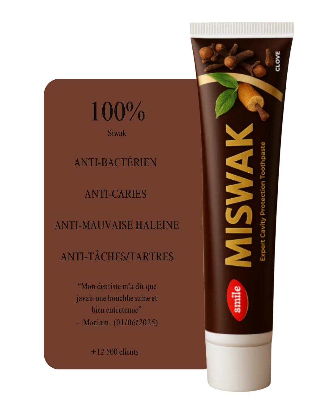 Le nouveau MiswakClove dernière édition 2025, c'est la nouvelle combinaison de dentifrice à base de siwak et de clou de girofle qui offre une protection complète tout en un.