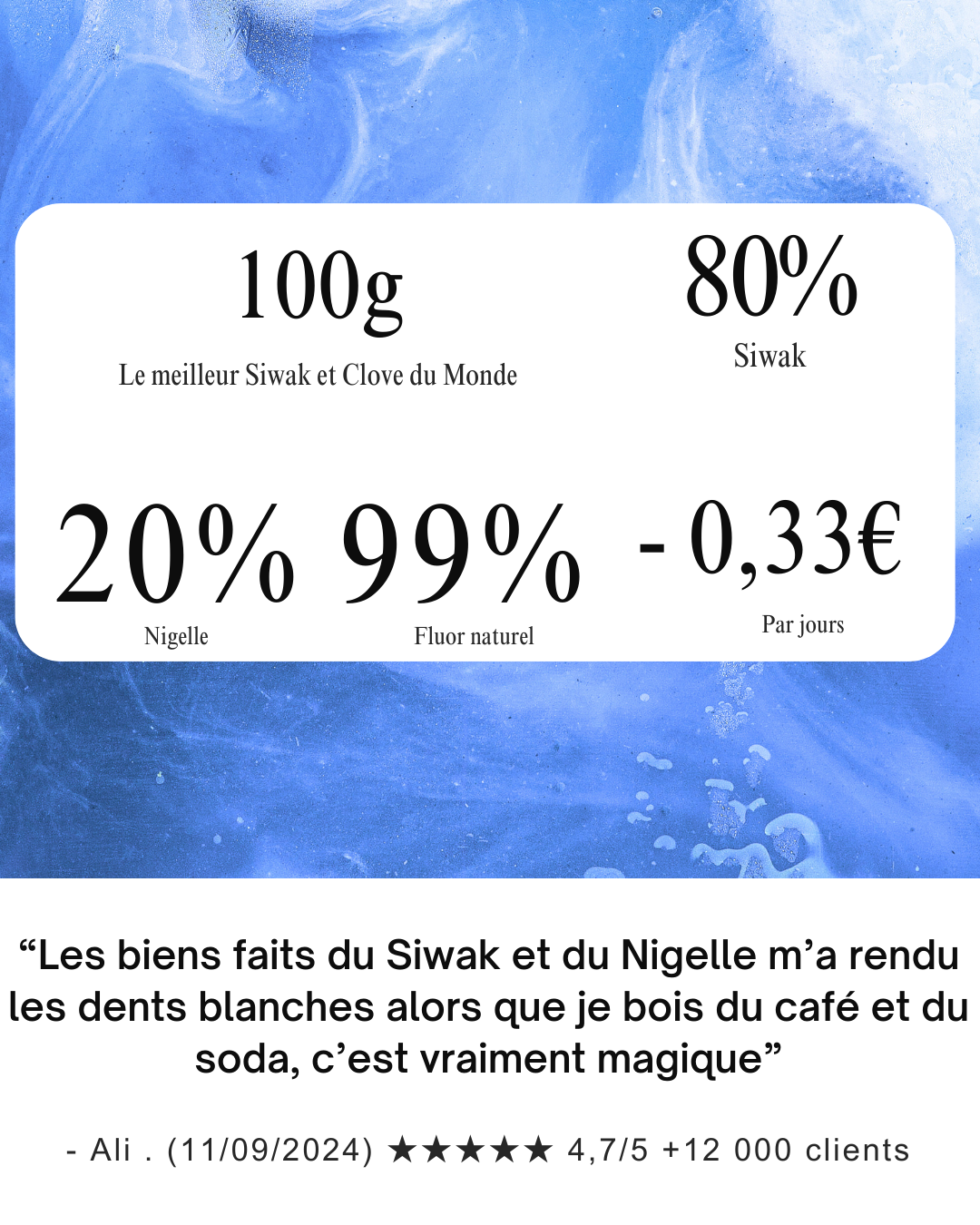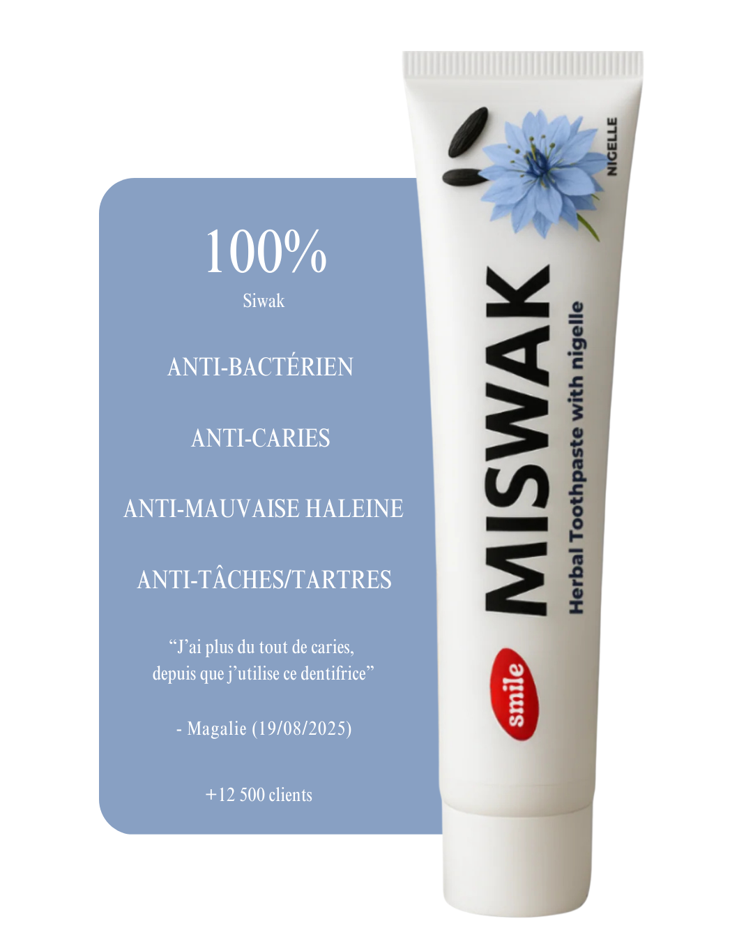 Le nouveau MiswakNigelle dernière édition 2025, c'est la nouvelle combinaison de dentifrice à base de siwak et de nigelle qui offre une protection complète tout en un.